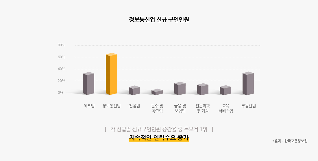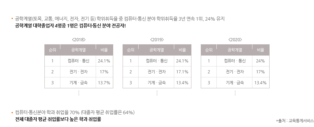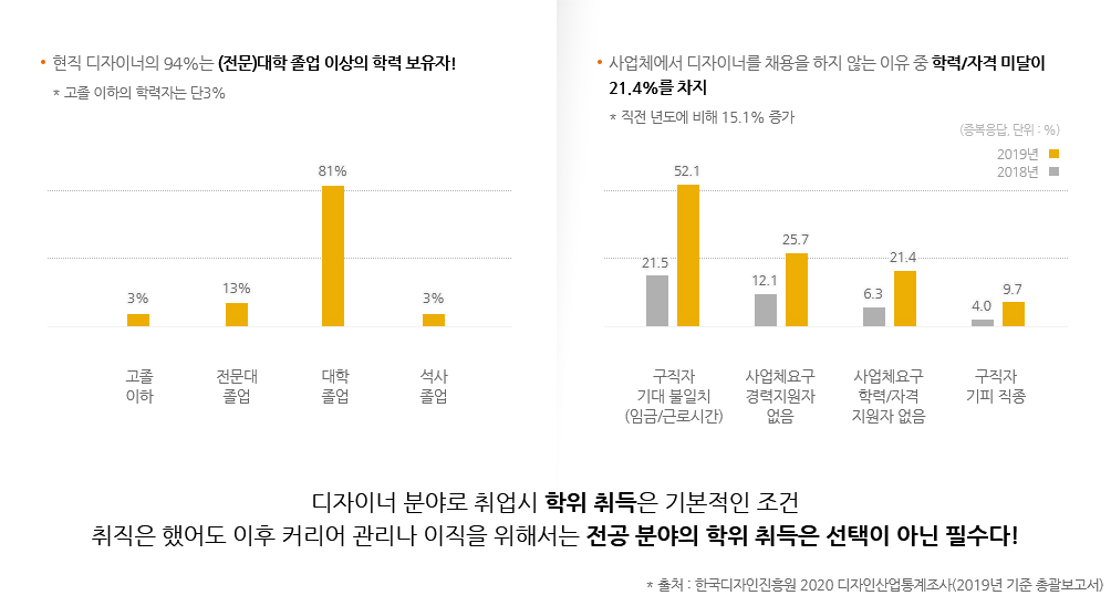 IT 및 디자인 분야의 특성 상 채용 시 기본적으로 실무 능력을 함양한 관련 자격증 소지자, 전공 학위자를 우대합니다. 최근 기업들이 학력 기준 철폐라는 기준을 내세우고 있으나, 대부분 유수 기업들은 학위 미취득자 보다는 취득자를, 비 전공자 보다는 전공자를 우대하여 채용하고 있으며 이는 채용 이후 연봉협상, 진급 등에도 계속 영향을 미칩니다.- 01채용 시 전공자 우대